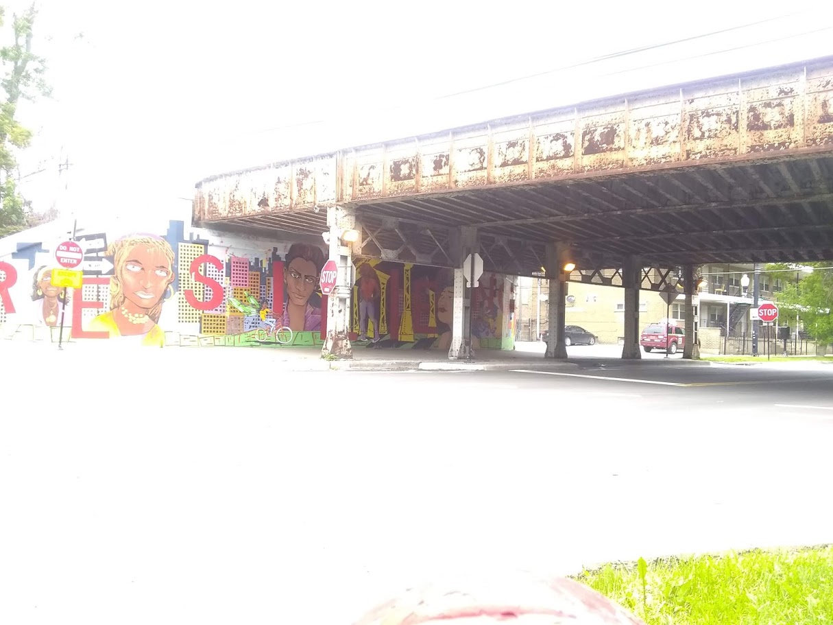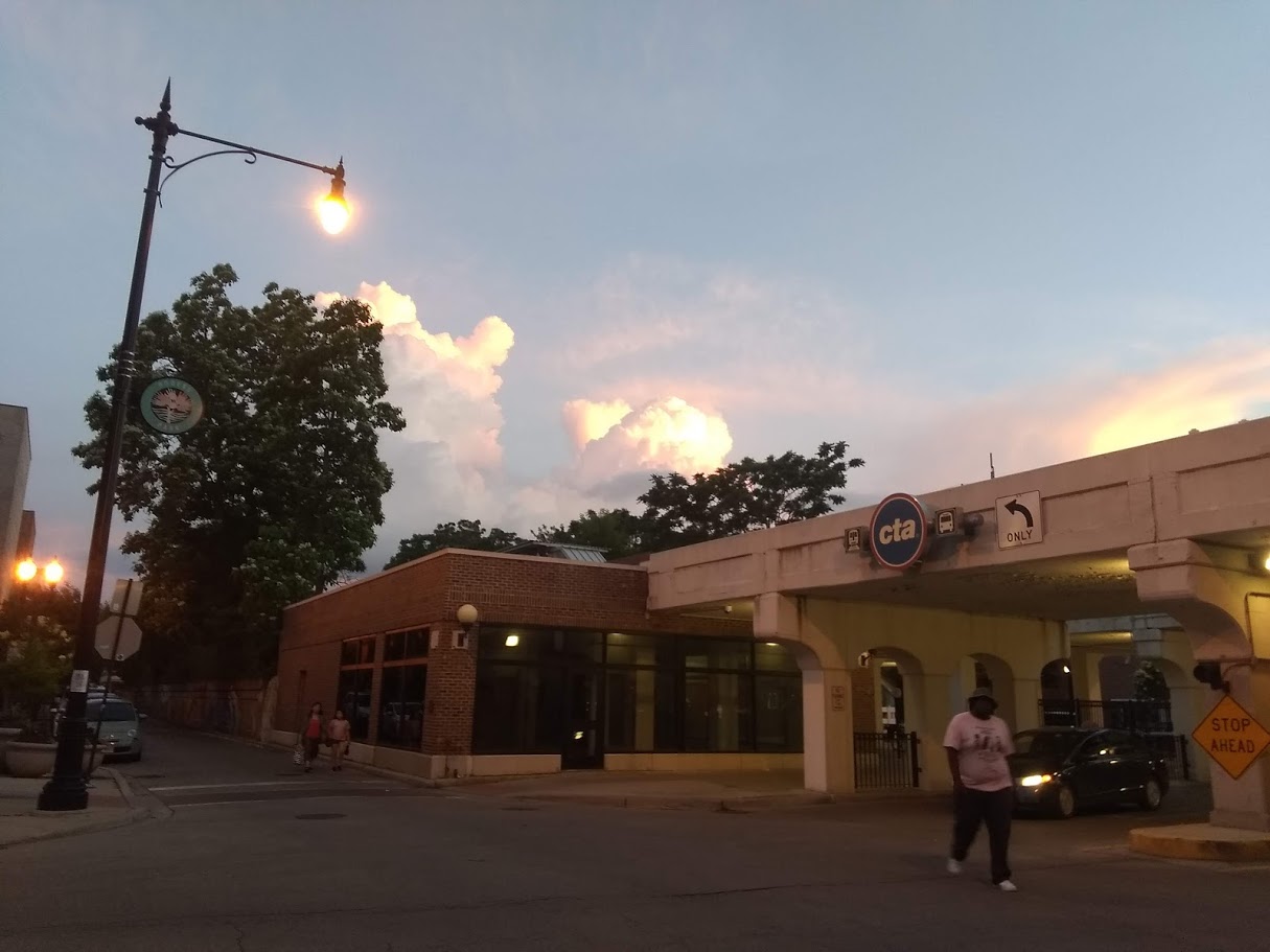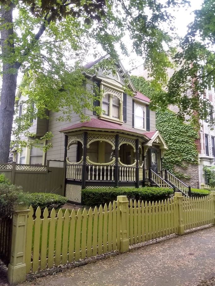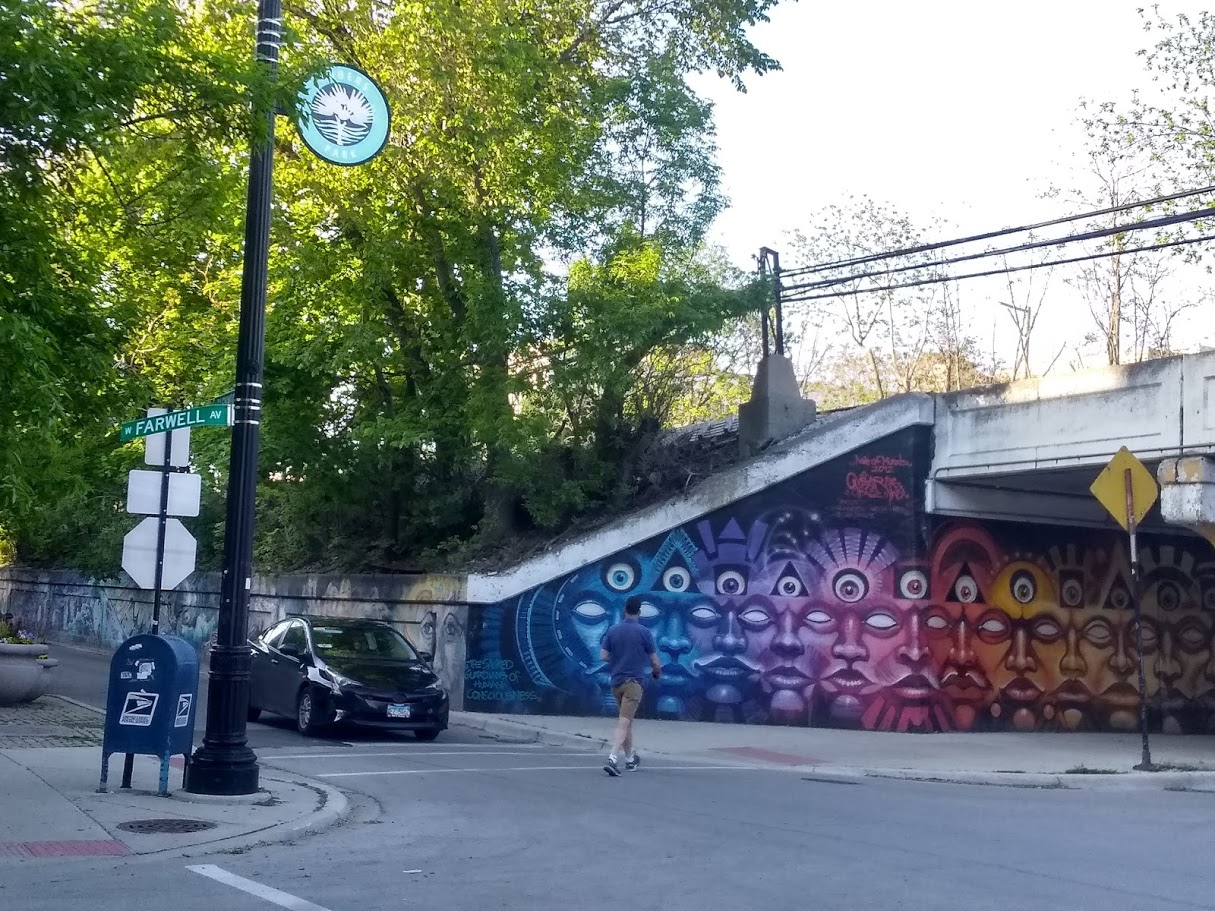 Clockwise, from top left; Rogers Park Beach and one of many magnficent skies, pretty Victorian house nestled amongst apartment buildings, evening sky with setting sun reflecting off clouds, shabby bridge turned art mural, other pretty Victorian house with a porch that I want.