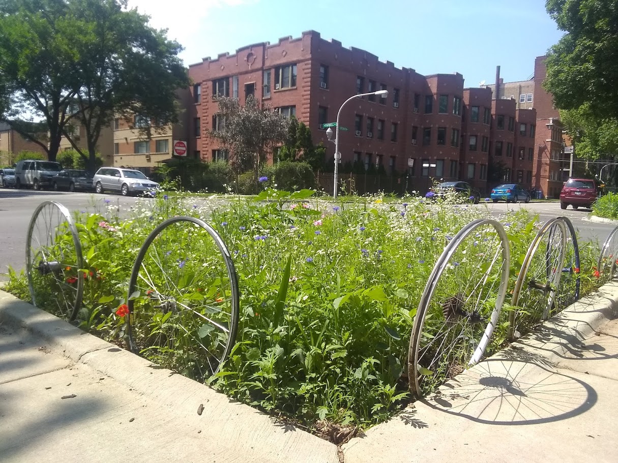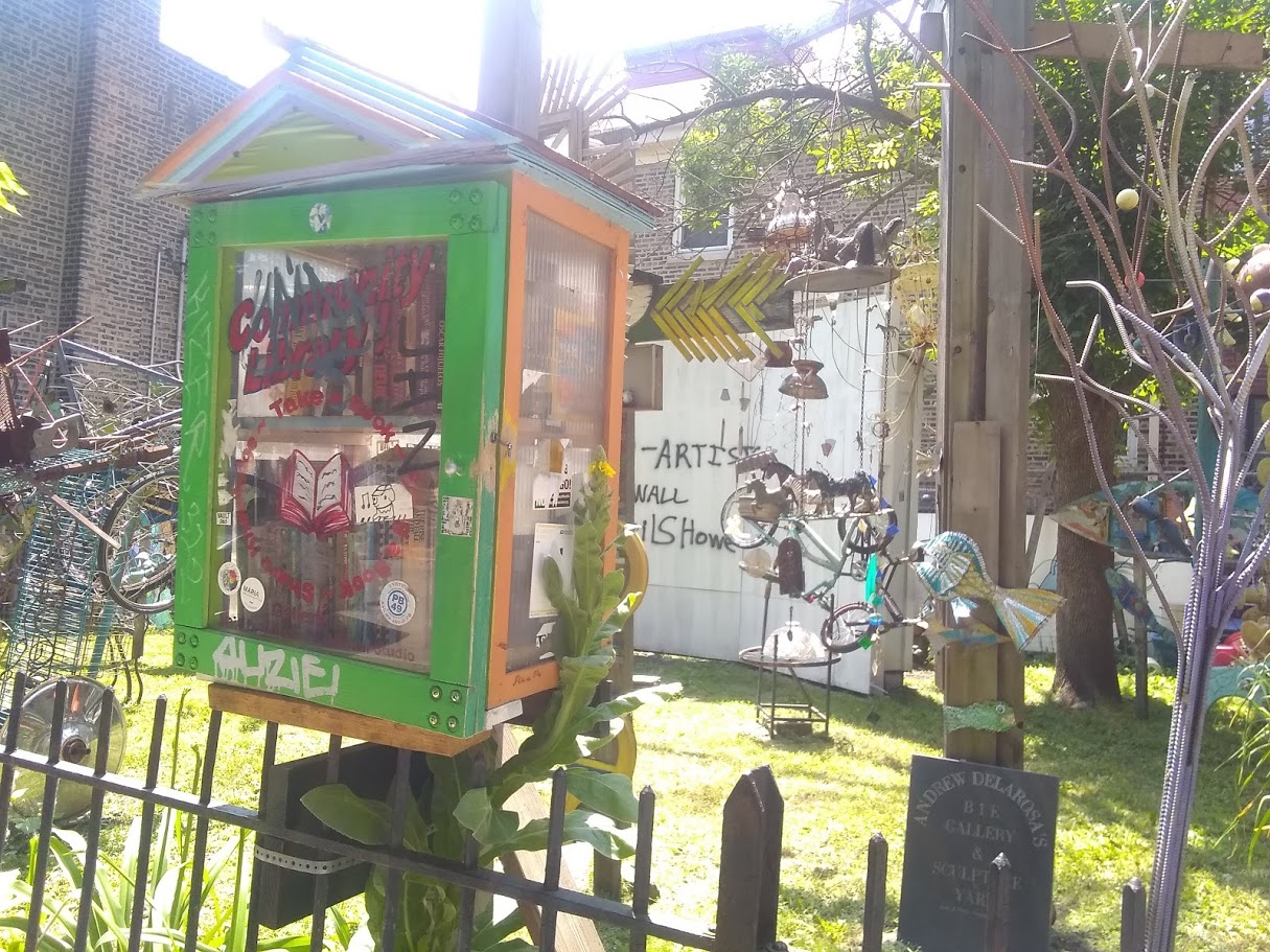Clockwise, from top left; railway murals, arty bridge, mini-garden on a sidewalk (look at the blue flowers!), give-a-book-take-a-book library box, Rogers Park library.