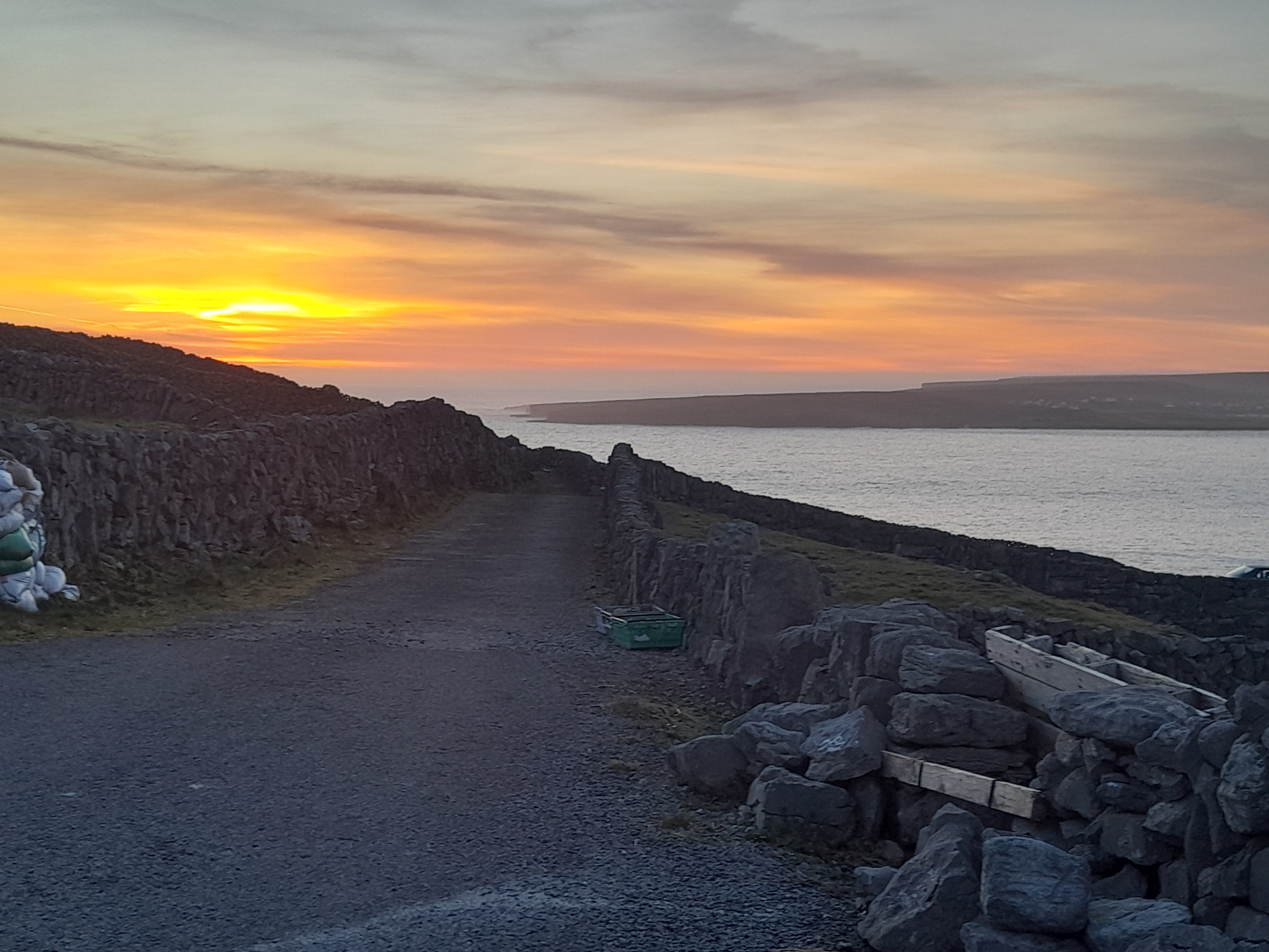It was the sun that alerted me to the seasonal change afoot. It was setting further and further west of Inis Mór and across several evenings, my already-beloved west Clare coast was a stunning array of colours. The cliffs were drenched in burnished orange and gilded brown, sometimes golden and even, on occasion, pink. Out my bedroom window, the sun seemed to skirt the horizon – the line between sea and sky a fiery orange thread. A little googling revealed that the sun sets further west every day – i.e. away from Inis Mór – until the spring equinox when the sun sets due west, and day and night are equal in length.