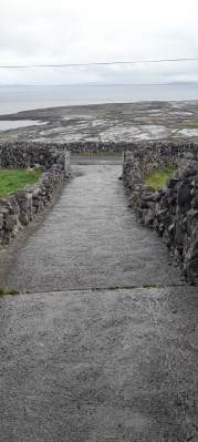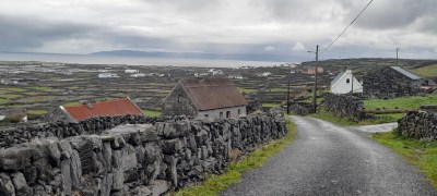 The road was the island’s spine, running east to west, from the Inis Oírr side to the Inis Mór side, the coast of Connemara parallel-ish. Rain hung over the mainland, obscuring sections of it, giving the mountains a faintly mystical look. Ideal scenery for a moodsome film.