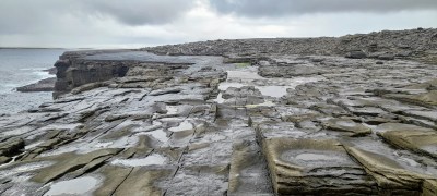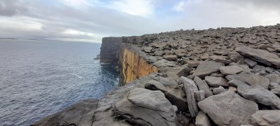 This is the most special part of Inis Meáin, these west-facing cliffs. If freedom had a face, this would be it. The cliff top is remarkable in its flatness, offering stunning views of waves crashing below. There’s a special sound or noise there – a ‘whompf’ sound, when swell is caught in the lower caves and spat back out. Amongst the brown rocks grow vividly coloured and hardy plants. Behind the brown, back from the edge, are masses of grey rocks thrust up by swells past.