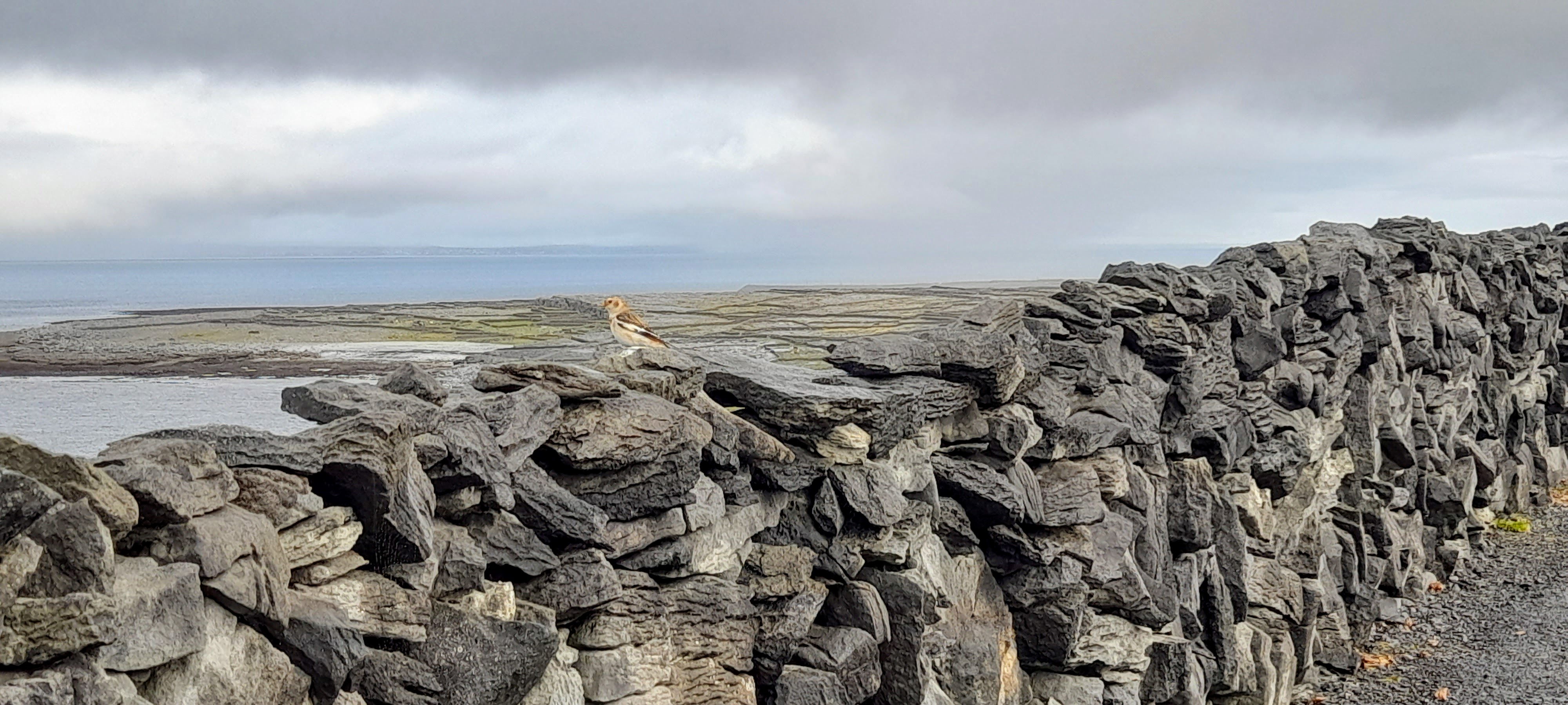 The air was damp and cold, and puffed clouds thwarted the sun’s effort to warm the land. Many of the fields to the front of the island are plains of limestone, with little grass. On sunny days, there’s warmth to be seen in the stone’s darkened colour. But in the dampness of this morning, the limestone was silver, cold even just to look at. Not all was grey however; traces of vivid blue battled through the clouds, and behind the ferry extended a trail of brilliant white surf.